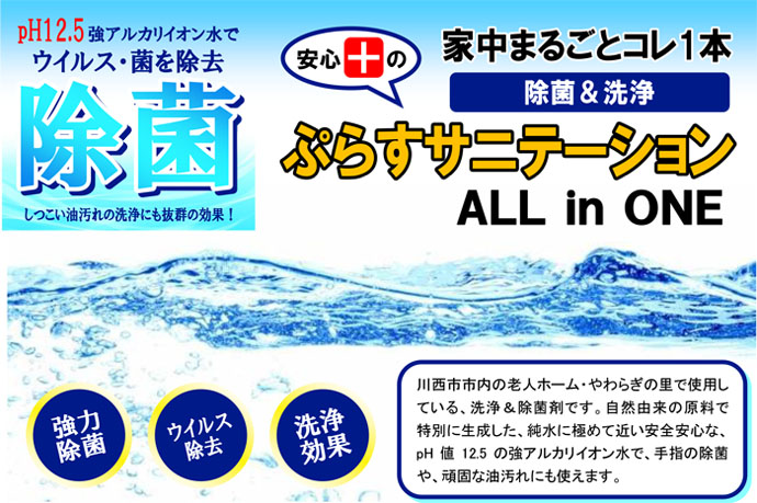 ぷらすサニテーションは強アルカリイオン電解水でpH値12.5。抜群の除菌&洗浄効果を誇ります。